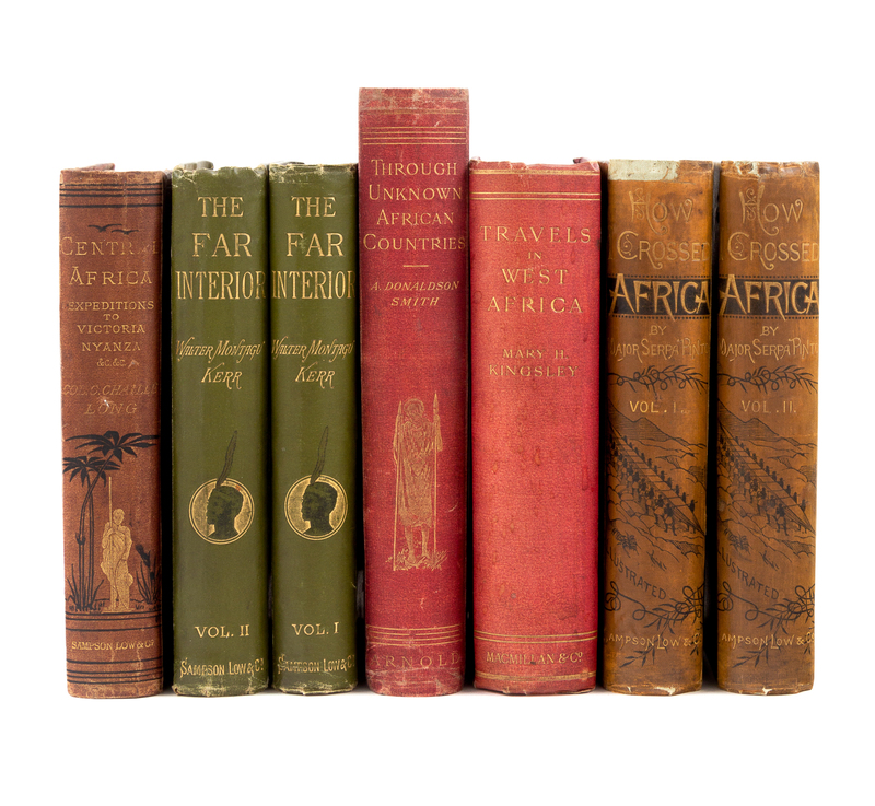 CHAILL-LONG, Charles (1842-1917). Central Africa: Naked Truths of Naked People... London: Sampson Low, Marston, et al., 1876. 8vo. Portrait frontispiece, folding route map outlined in color, numerous wood-engraved plates and numerous in-text engraved illustrations. -- SERPA PINTO, Alexandre Alberto da Rocha de (1846-1900). How I Crossed Africa: from the Atlantic to the Indian Ocean. London: Sampson Low, 1881. 2 volumes, 8vo. Numerous route maps (one folding in rear cover pocket), 24 wood-engraved plates, numerous in-text engravings, 3 facsimiles on 2 sheets. -- KERR, Walter Montagu (1814-1888). The Far Interior: A Narrative of Travel and Adventure from the Cape of Good Hope across the Zambesi to the Lake Regions of Central Africa. London: Sampson Low, 1886. 2 volumes, 8vo. Photographic frontispiece portrait in vol. I, large folding route map, 21 wood-engraved plates, numerous in-text wood-engravings. -- SMITH, Arthur Donaldson (1866-1939). Through Unknown African Countries. The First Expedition from Somaliland to Lake Rudolf. New York and London: Edward Arnold, 1897. 8vo.Frontispiece portrait, numerous illustrations, 6 folding route maps. -- KINGSLEY, Mary H. (1862-1900). Travels in West Africa. Congo Francaise, Corisco and Cameroons. London: Macmillan & Co., 1897. 8vo. Numerous plates and in-text illustrations. -- Together, 5 works in 7 volumes, all FIRST EDITION, all in original publisher's bindings, condition generally good.