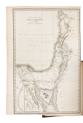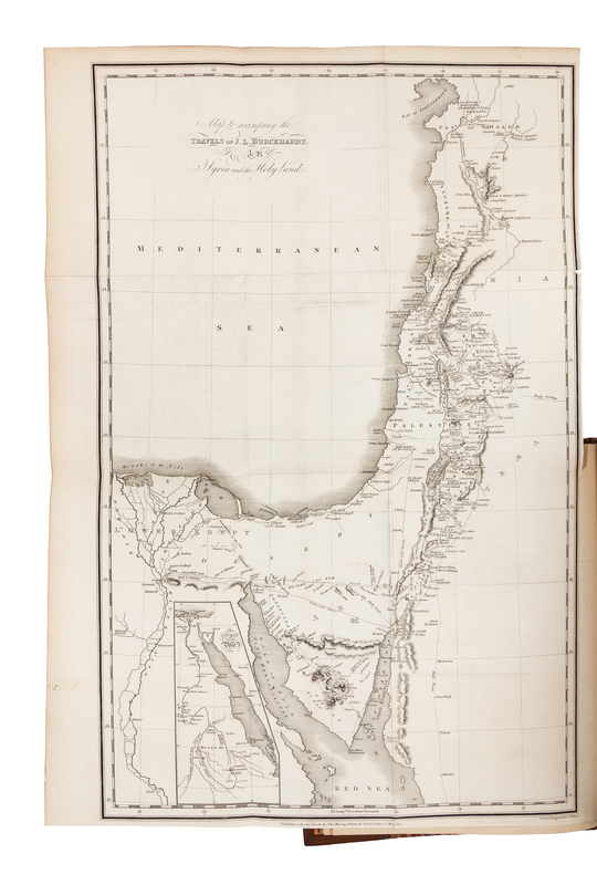 4to (275 x 213 mm). With lithographed portrait, folding engraved frontispiece route map, and 5 maps and charts (1 folding). (Lacking half-title; some slight browning overall.) Modern half calf gilt. Provenance THeodore Lyman (signature dated 1899).FIRST EDITION. "Edited by William Leake, these journals describe Burckhardt's various journeys between 1810 and 1816. It was at Aleppo that he studied Arabic in preparation for his later travels and he toured Syria and the Holy Land making the first visit by a European to Petra" (Blackmer). Atabey 166; Blackmer 237; Weber I, 107