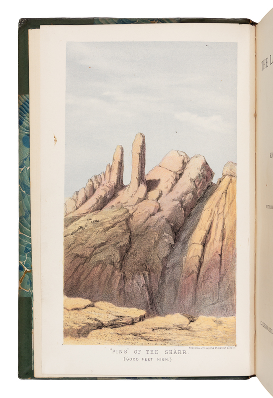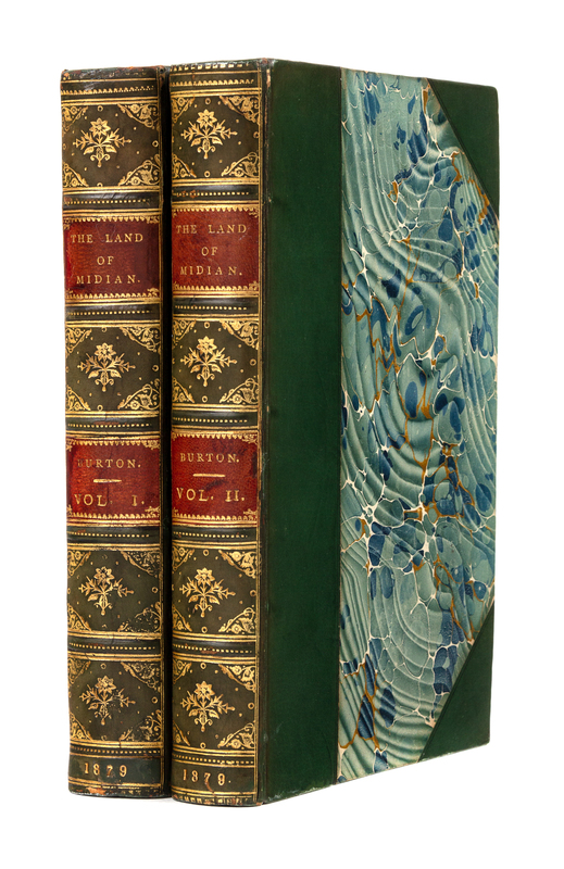 2 volumes, 8vo. With folding map & 16 plates (6 hand-colored). Early 20th-century half calf by Morrell.FIRST EDITION. Burton's 1877-78 second expedition into the Midian, which, like his first in 1877, was financed by the Khedive in Cairo as a search for gold. He mapped a 600-mile route through the northern and southern Midian recording its ruined ancient cities. For the Khedive in Cairo he brought back twenty-five tons of minerals to be assayed. For himself, he seriously considered forming a company to exploit the oil resources of the Midian but nothing came of it. Only 1000 copies were printed. A tall fresh copy. Penzer, pp 96-97.