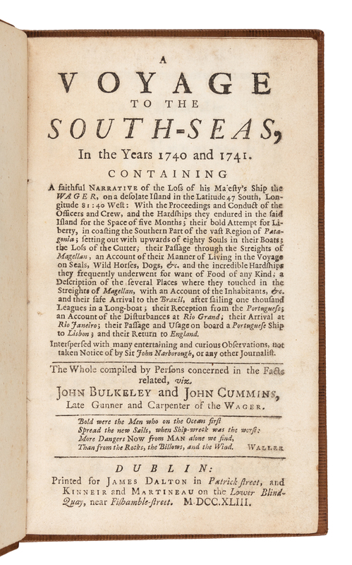 12mo (160 x 95 mm). Modern calf gilt (front endpaper mounted on pastedown obscuring provenance). Later edition, an abridged "popular" edition of the earlier published account of the voyage. The authors were respectively gunner and carpenter of the 'Wager', a ship of George Anson's fleet which rounded Cape Horn and ran aground on 14 May 1741 in the Guayaneco Archipelago on the southern coast of Chile. After the loss of the Wager, Bulkeley and Cummins organized the mutiny against Captain Cheap. This narrative describes how the mutineers made their way back through the hazardous navigation of the Straits of Magellan in a surviving longboat, named 'Speedwell', to eventually reach Rio de Janeiro. This Dublin edition was published the same year as the octavo London first edition and another octavo Dublin edition. Headland 109; Sabin 9108 note.