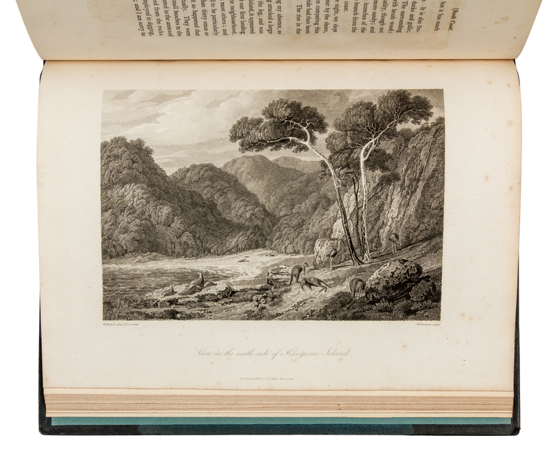 Text only, 2 volumes (of 3, lacking atlas), large 4to (325 x 243 mm). With 9 engraved plates by William Westal. (Some minor spotting.) 19th-century half green morocco (minor scuffing to extremities). Provenance: John Robinson, Civil Engineer (bookplate).FIRST EDITION OF THE TEXT OF THE FLINDERS' MONUMENTAL WORK OF AUSTRALIAN EXPLORATION. "Flinders was the first commander to circumnavigate the Australian continent, and the first to give it its present name" (Hill). Flinders sailed from England on 18 July 1801, and during the next two years he surveyed the entire coast of Australia from Cape Leeuwin to Bass Strait. He returned to Port Jackson in 1803 having completed the first circumnavigation of Australia, thus establishing it as a continent. Flinders devoted the remainder of his life to the publication of this work, which was formally published one day before his death on 19 July 1814. It is a day-by-day record of the expedition but also includes a lengthy introduction detailing earlier South Seas voyages and an appendix by Robert Brown, the botanist accompanying the expedition. Flinders took great pains to insure the accuracy of the work which is of monumental cartographical significance. Wantrup calls Flinders' narrative "the most outstanding book on the coastal exploration of Australiathe centerpiece of any collection of books dealing with Australian coastal discovery" (Wantrup, p.144). The two text volumes were originally accompanied by a folio atlas containing 16 charts and 12 engraved plates. Ferguson 576; Hill 614; Ingelton 6487; Kroepelien 438; Nissen BBI 673; Stafleu & Cowan TL2 1806; Wantrup 67a.