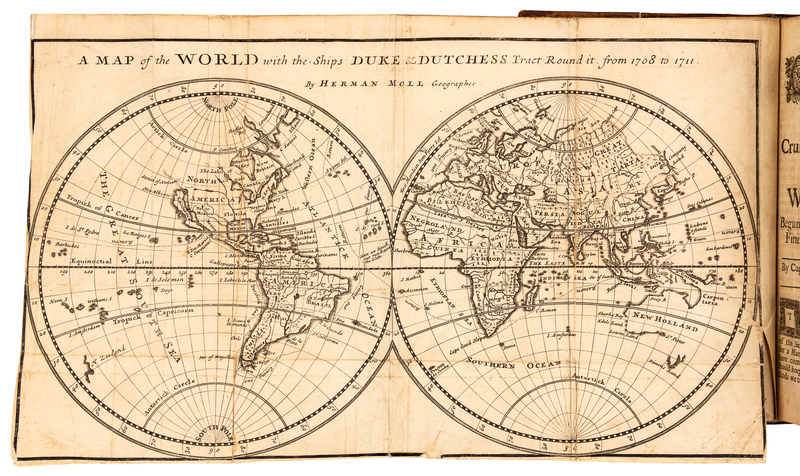8vo (194 x 115 mm). With engraved folding route map (mounted on linen), 4 engraved folding maps. (Map of South Sea Coast with 2-in. separation to fold of map with minor loss and other repairs to verso, minor browning, title-page a little soiled.) Contemporary calf (rebacked to match).FIRST EDITION OF ROGERS' CLASSIC PRIVATEERING ACCOUNT, A SOURCE FOR ROBINSON CRUSOE. Rogers' privately funded voyage was more financially successful than any since Drake and Cavendish; Rogers maintained good order despite a "mongrel crew and with officers often mutinous." Privateer William Dampier was pilot and navigator (see lot 53). After they rounded Cape Horn, they sheltered at Juan Fernandez; there, they rescued Alexander Selkirk, whose story (as told by Rogers) was an inspiration for Daniel Defoe's Robinson Crusoe. Their attack on Spanish ships on the west coast of Mexico and South America resulted in the taking of an Acapulco galleon (among others), whose bounty included important information in the form of maps. Included here are 5, taken by Rogers from "The best Spanish manuscript draughts." Alden & Landis 712/194; Borba de Moraes II:213-14; Cowan I p.194; Hill 1479; Sabin 72753; Streeter IV:2429.