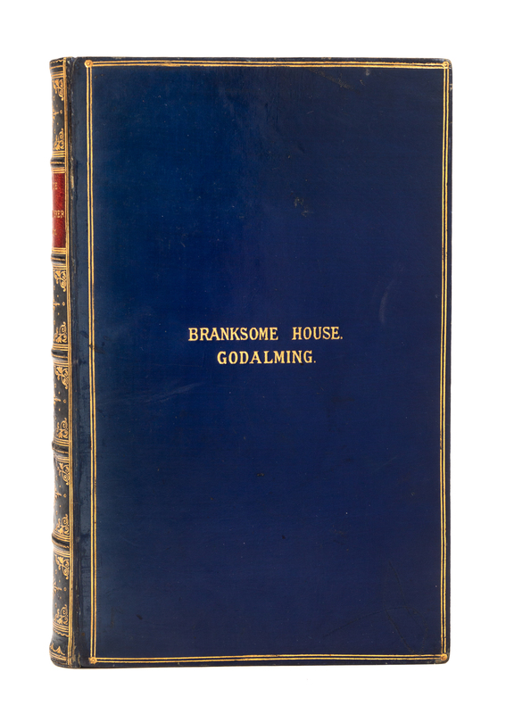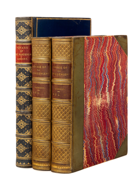 [With:]LAMBERT, C. and S. The Voyage of the "Wanderer". London: Macmillan and Co., 1883. 8vo. Color-printed folding map, numerous chromolithographic plates, numerous wood-engravings. Contemporary polished blue calf prize binding gilt, by Bickers. FIRST EDITION.