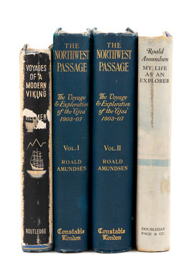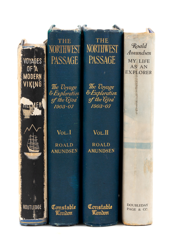 AMUNDSEN, Roald. The North West Passage. Being the Record of a Voyage of Exploration in the Ship Gjoa. London: Archibald Constable and Co., 1908. 2 volumes, 8vo. Photogravure frontispieces, 2 folding maps in rear pockets, numerous in-text illustrations. -- AMUNDSEN, Roald. My Life as an Explorer. New York: Doubleday, Page, 1927. 8vo. Frontispiece, 3 maps and diagrams. ORIGINAL DUST JACKET. -- HANSSEN, Helmer. Voyages of a Modern Viking. London: George Routledge & Sons, 1936. 8vo. Frontispiece portrait, photographic plates, double-page map. Original printed dust jacket. -- Together, 3 works in 4 volumes, all FIRST EDITIONS, all in original publisher's cloth with dust jackets as indicated, condition generally fine.