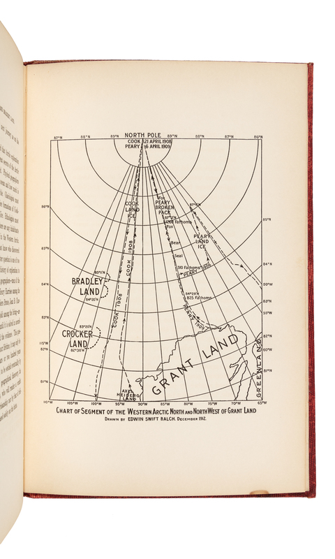 8vo. With a sketch map in text. Original publisher's gilt-lettered red cloth (some spotting). FIRST EDITION, PRESENTATION COPY, inscribed by the author on endpaper: "Miss Elisabeth McClellan with the compliments of the author." Balch's attempt to present the facts in the Peary-Cook debate. Peary and Cook clashed over who had been the first to reach the North Pole-Balch here sides with Cook, although the courts and public opinion at the time did not. Bradley Land is the name that Frederick Cook gave to land that he claimed to have seen in the Arctic in 1909. Arctic Bibliography 999; Ricks p. 32; Tourville 363; Wickersham 4884.[With:] COOK, Frederick Albert (1865-1940). My Attainment of the Pole. Being the Record of the Expedition that First Reached the Boreal Center 1907-1909. With the Final Summary of the Polar Controversy. New York: The Polar Publishing Co., 1911. 8vo. With frontispiece portrait, plates & illustrations. Original publisher's pictorial brown cloth. FIRST EDITION. Arctic Bibliography 3389.