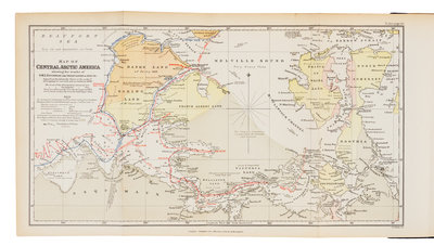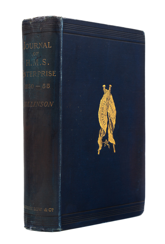 8vo (213 x 134 mm). Chromolithographed frontispiece, 6 color-printed folding maps (one map repaired at fore-edge, a few small chips), photogravure portrait. (Dust-stain along a few extreme edges.) Publisher's blue cloth gilt (repaired at spine ends).FIRST EDITION of the posthumously published journal by the captain who came closest to the site where Franklin's expedition ended. "In 1849 Collinson was appointed to command an expedition for the relief of Sir John Franklin, by way of the Bering Strait; he himself had command of the Enterprise, and with him was Commander Robert Le Mesurier McClure in the Investigator. The two ships sailed together from Plymouth on 20 January 1850 but unfortunately separated in the neighbourhood of Cape Horn and did not meet again. The Enterprise passed Point Barrow, Alaska, on 21 August, but the ice forced Collinson to return south and winter in Hong Kong. In 1851 he was again hampered by ice and in 1852 was frozen in at Cambridge Bay for the winter. In 1853 the Enterprise was caught in the ice at Camden Bay, and there passed a third winter. She reached Point Barrow on 8 August 1854, after being shut up in the Arctic, entirely on her own resources, for upwards of three years. Of the many who had searched for Franklin, Collinson came closest to the place where the expedition had ended. Collinson's addition to geographical knowledge on this Arctic trip was very considerable, and would have been tantamount to the discovery of the north-west passage, had this not been already actually achieved by the men of the Investigator" (DNB). RARE. Arctic Bibliography 3351; Hill 337; Ricks p 68; Tourville 986.