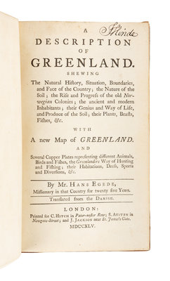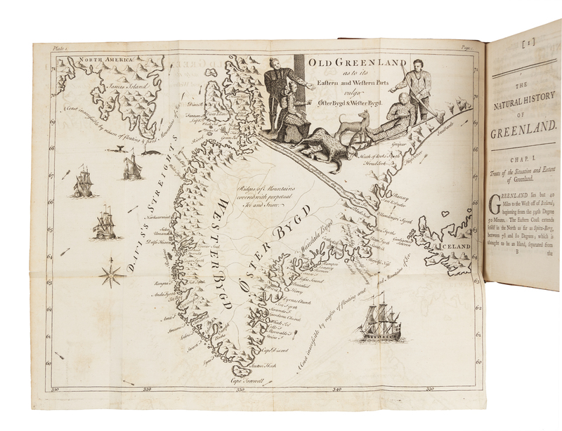 8vo (193 x 109 mm). With folding engraved map & 11 engraved plates. (Some light offsetting.) Early 19th-century calf gilt. Provenance: J. Hinde (signature).FIRST ENGLISH EDITION of an exhaustive Danish history of Greenland, with a detailed description of life among the native Greenlanders. Includes a discussion of whaling. Arctic Bibliography 4363; ESTC T144751; European Americana 745/74; Sabin 22028.