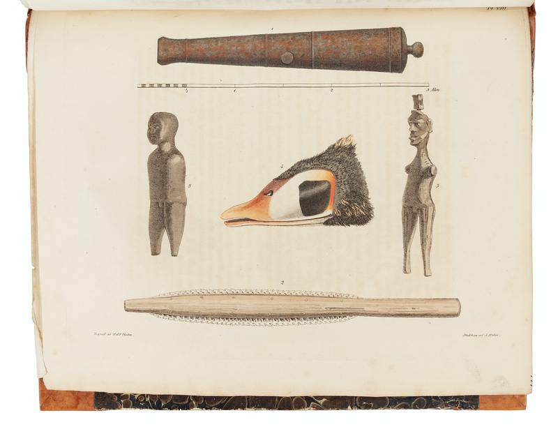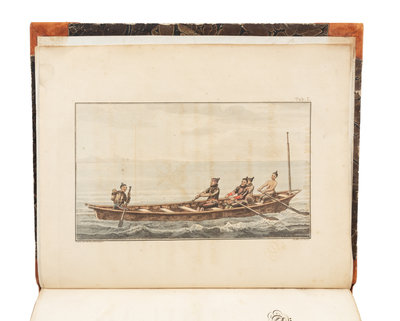 4to. With large engraved folding map & 8 hand-colored engraved plates. (Some minor browning or soiling.) Contemporary half calf. Provenance: Hindrup? (signature).FIRST EDITION of the account of the Royal Danish expedition to the east coast of Greenland in 1828, printed from its Commander's diary. The fine hand-colored plates depict Eskimo umiaks and kayaks, their implements and summer dwellings, and ruins of Norse settlements. Arctic Bibliography 6032; Sabin 28178. RARE.
