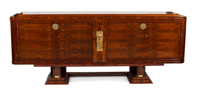 An Art Deco Brazillian Rosewood Gilt Bronze Mounted Sideboard Height 41 1/2 x width 103 1/2 x depth 20 inches.