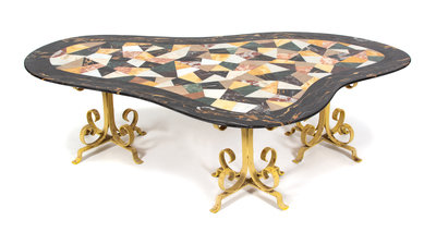 An Italian Boomerang-Form Marble Specimen Table on Painted Wrought Iron Base Height 17 x width 53 x depth 30 inches.