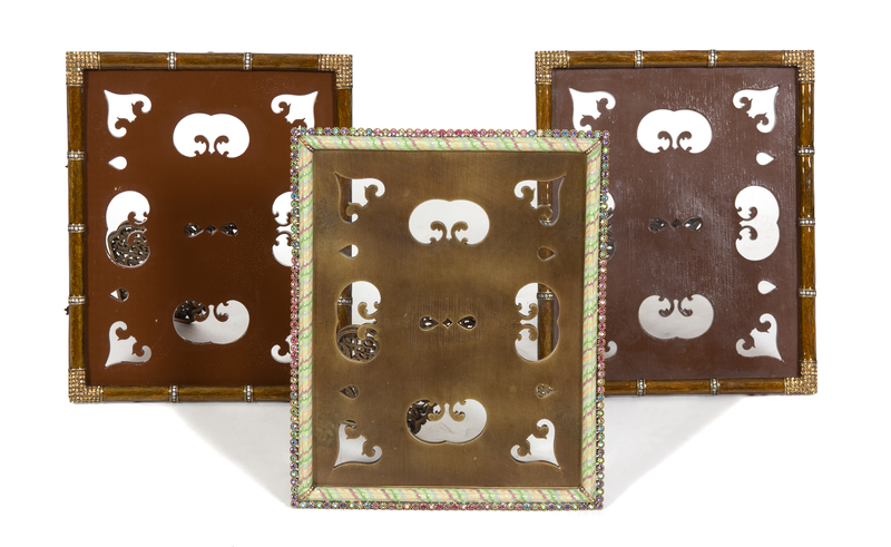A Group of Three Jay Strongwater Jeweled and Enameld Easel Back Picture Frames Height of taller 11 1/8 inches.