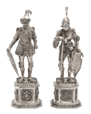 A Pair of German Hanau Silver Knights, 19TH CENTURY, depicting knights in full armor standing on pedestal bases.