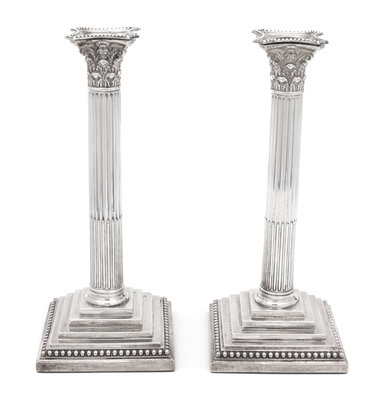 A Pair of English Weighted Silver Columnar Candlesticks, William Hutton & Sons, London, 1890,