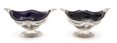 A Pair of English Silver Oval Footed Baskets, Charles Stuart Harris, London, 1896, of boat form with reticulated decoration overall, wi