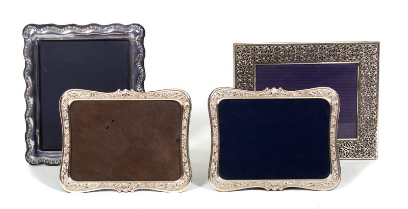 Four Sterling Silver Framed Easel Back Picture Frames Largest, height 13 x width 10 3/4 inches.