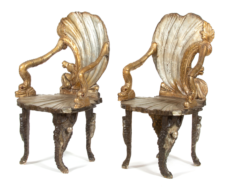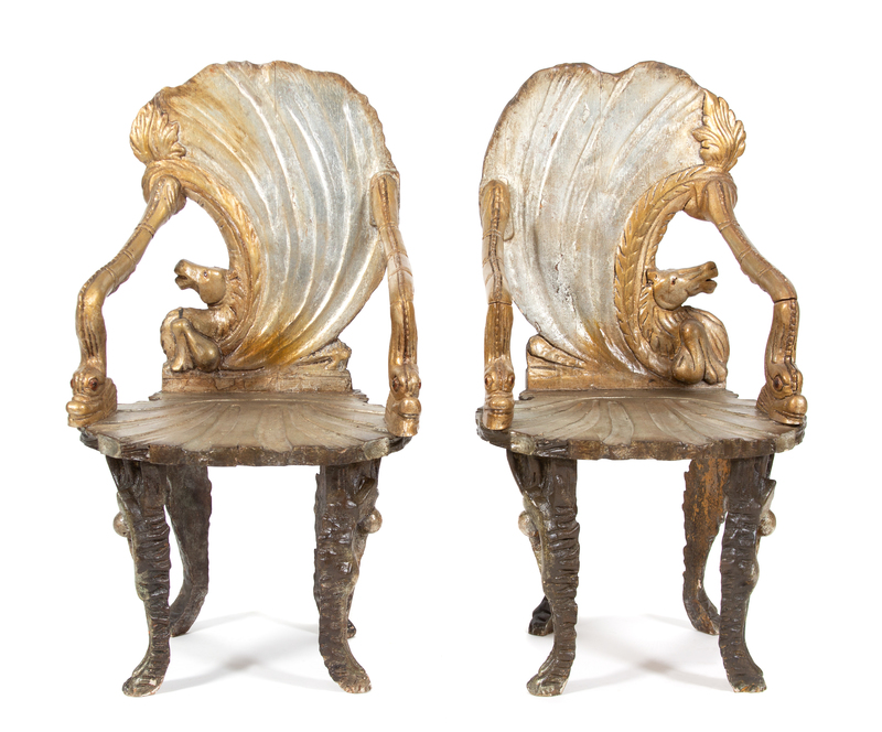 each having oyster shell and seahorse carved back, sea serpent arms and shell carved seat.