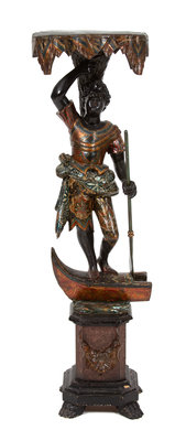 A Venetian Polychrome and Gilt Blackamoor Pedestal Height 44 1/4 inches.