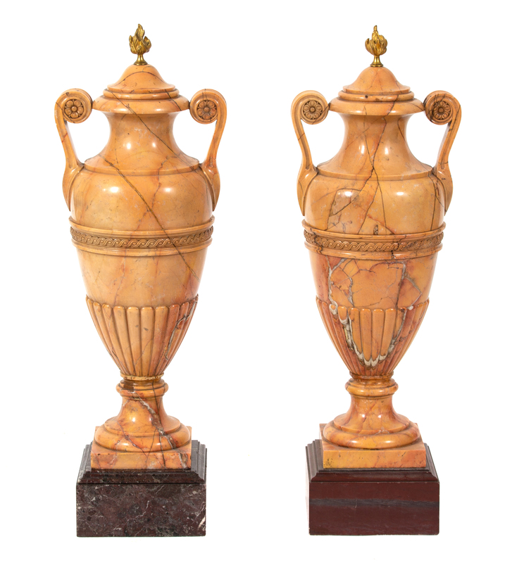 A Pair of Italian Crema Valencia Marble Double-Handled Urns Height 30 x diameter 10 1/2 inches.