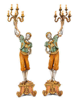 A Pair of Venetian Style Silvered Blackamoors Height 84 x width 22 x depth 20 inches.