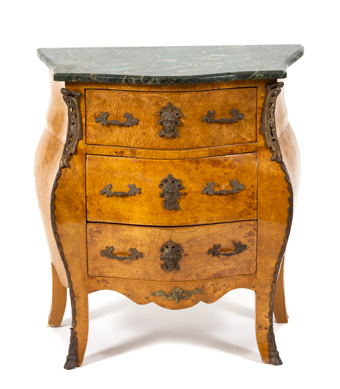 A Louis XV Style Gilt Metal Mounted Burlwood Commode Height 29 1/2 x width 26 x depth 16 inches.