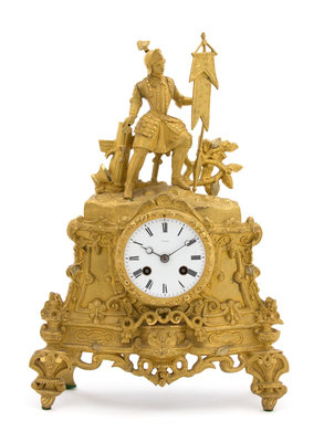 A French Gilt Bronze Figural Mantle Clock Height 16 x width 10 x depth 3 inches.