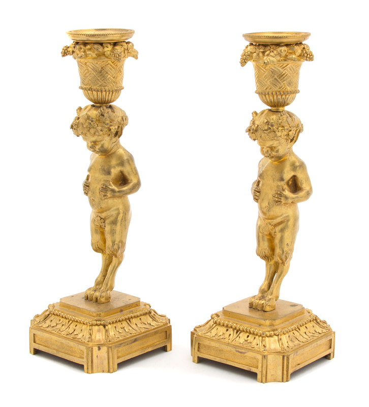 A Pair of French Gilt Bronze Candlesticks Height 8 x diameter squared 3 inches.