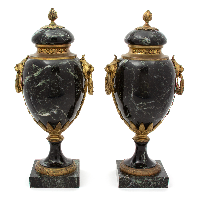 A Pair of French Black Marble Urns with Gilt Metal Mounts Height 16 1/2 x diameter 6 inches.