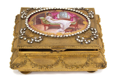 A French Gilt Bronze Jeweled Box with Oval Portrait Miniature Height 3 x width 6 1/8 x depth 5 inches.