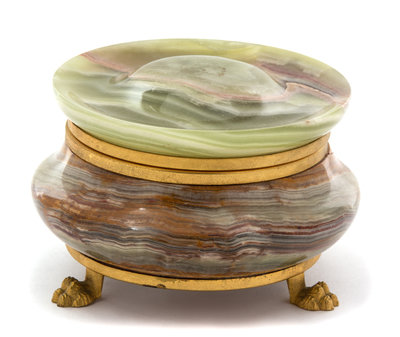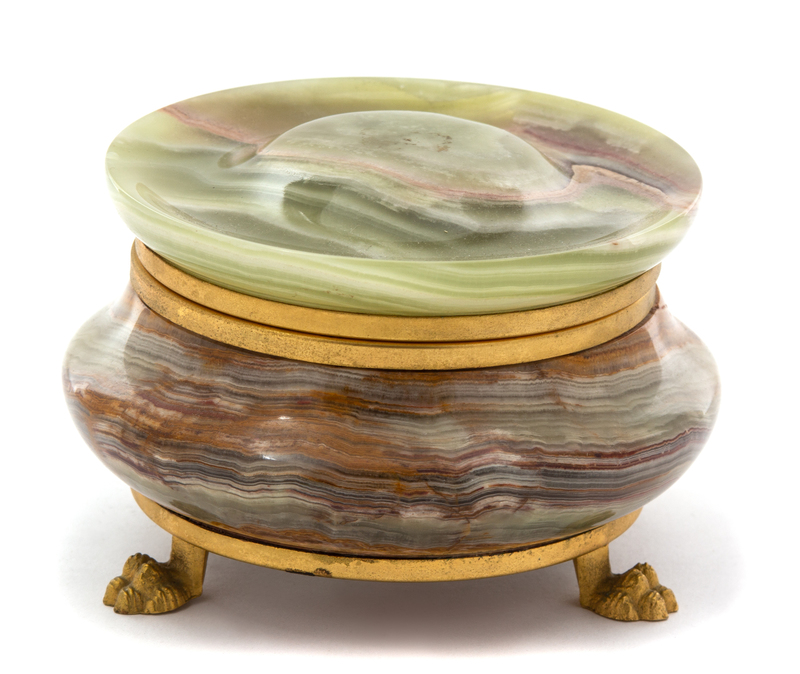 A French Gilt Bronze Mounted Onyx Hinged-Top Circular Box Height 3 1/8 x diameter 5 1/2 inches.