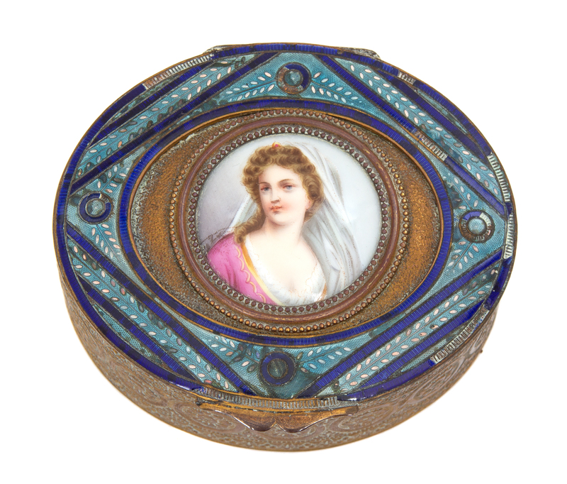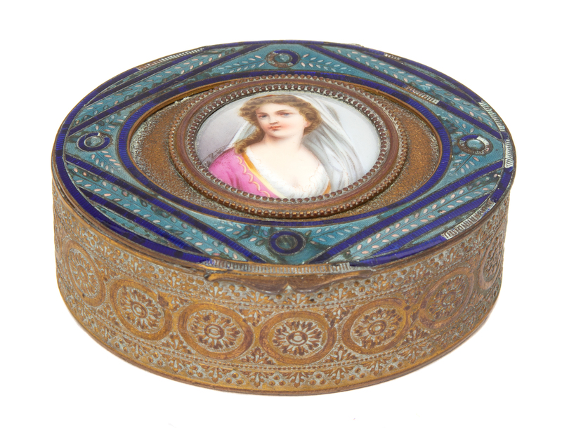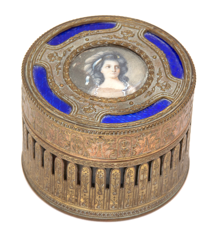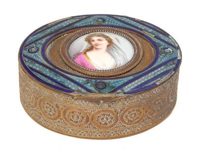 Two French Gilt Bronze and Enamel Portrait Snuff Boxes Height of largest 1 x width 3 1/2 inches.