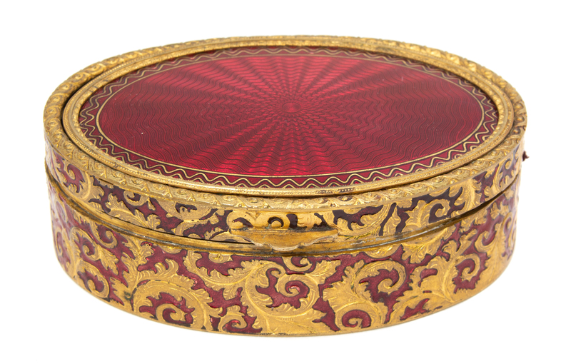 having red enamel radiating from a central point, with gilt metal foliate design on sides, velvet interior.
