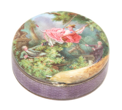 A French Porcelain Mounted and Gilt Metal Snuff Box Diameter 2 1/2 inches.