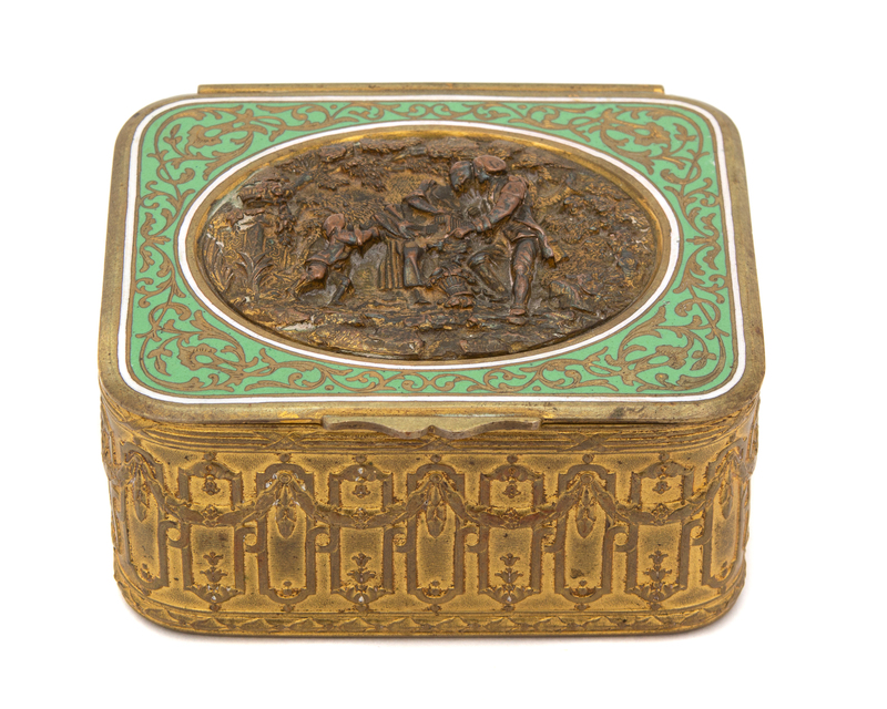 the top having an oval bas relief scene of a courting couple surrounded by green enamel scrollwork.