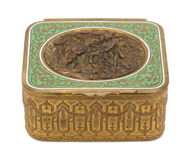 A French Gilt Bronze and Enamel Box Height 1 1/4 x width 3 3/4 x depth 3 1/8 inches.