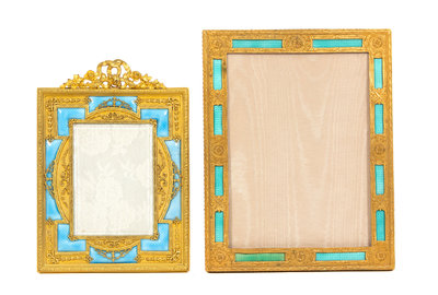 Two French Gilt Bronze and Enamel Easel Back Frames Larger, height 11 3/4 x width 9 3/4 inches.