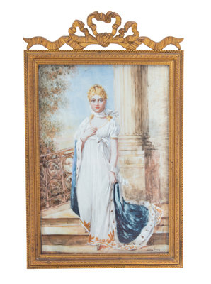 mounted with a painting depicting a Lady descending stairs, signed Jenny Savy.