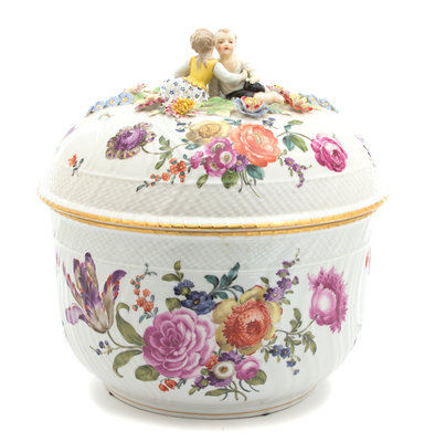 A Ludwigsburg Hard Paste Porcelain Lidded Tureen Height 16 x diameter 11 1/2 inches.