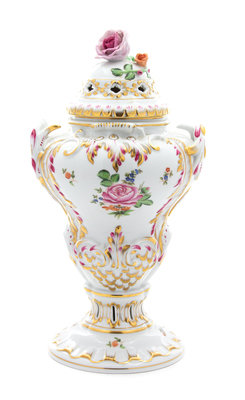 A Herend Hand Painted Porcelain Covered Urn Height 15 x width 7 1/2 x depth 7 inches.