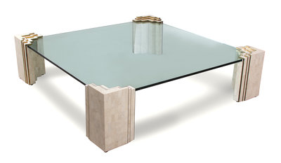 A Contemporary Tesselated Stone and Brass Glass Top Coffee Table Height 17 x squared diameter 63 1/2 inches.