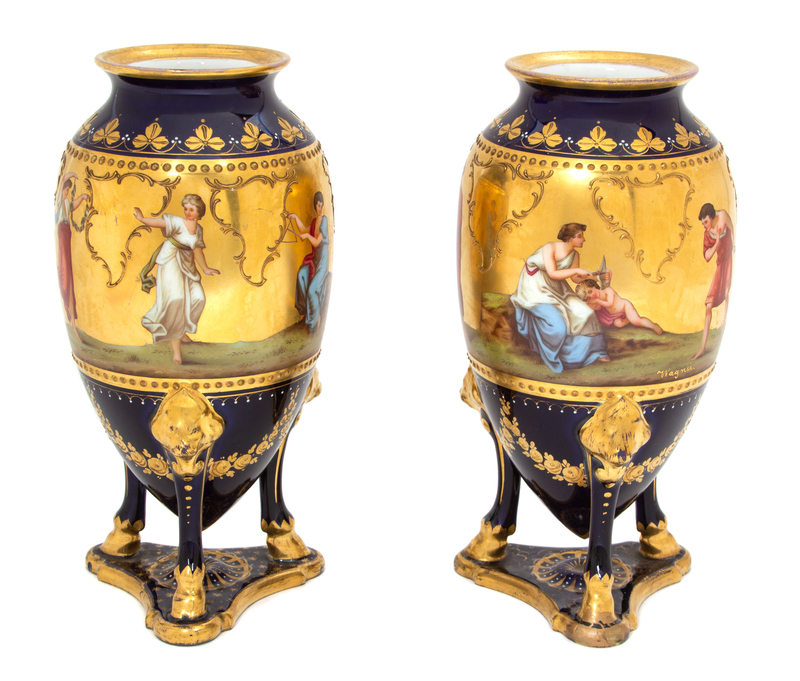 comprising a pair of vases and a center covered urn. Vases are on tripod bases, in the Aglaia pattern. All pieces having a cobalt ground with a wide gilt band decorated with polychromed maidens and signed Wagner, marked on base.