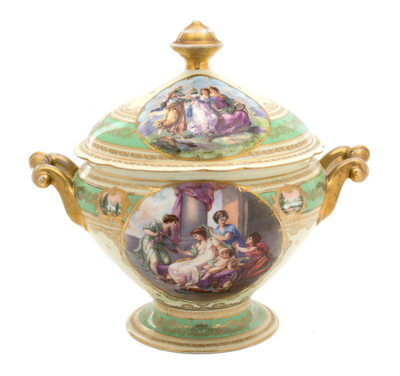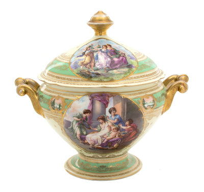 A Royal Vienna Porcelain Polychrome and Gilt Decorated Soup Tureen Height 13 1/2 x width 12 1/2 x depth 10 inches.