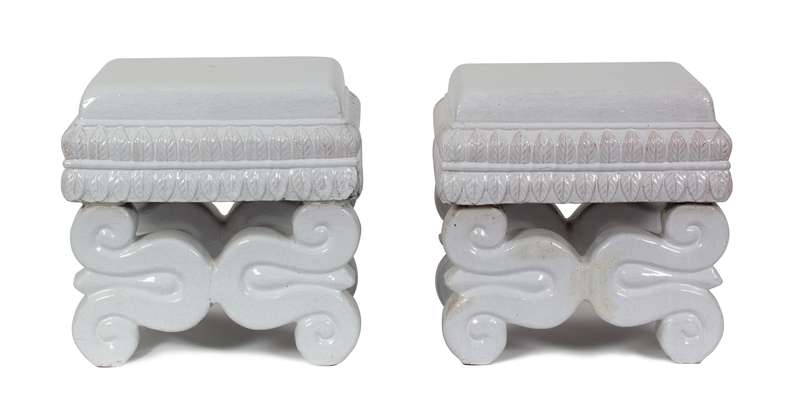 A Pair of Continental White Glazed Ceramic Stools Height 16 1/2 x width 16 1/2 x depth 12 1/2 inches.