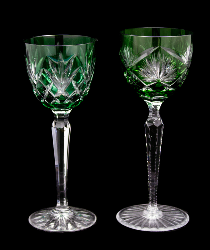 Twelve Bohemian Green-Cut-to-Clear Crystal Stemmed Wines Height of taller three 8 1/4 inches.