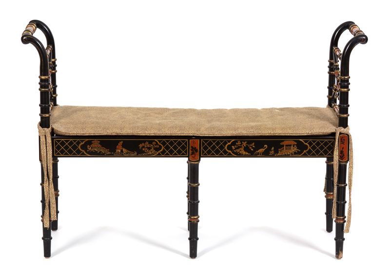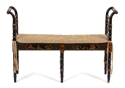 A Regency Style Painted and Parcel Gilt Rush Seat Window Bench Height 29 1/2 x width 43 x depth 13 inches.