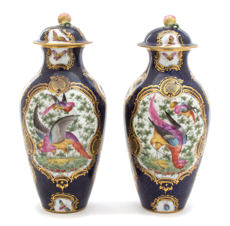 A Pair of English Chelsea Polychomed Porcelain Lidded Urns Height 10 1/2 x diameter 4 1/2 inches.