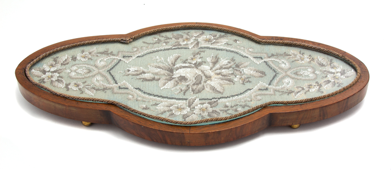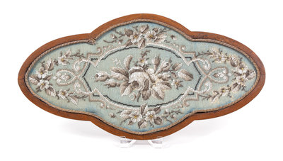 A Victorian Beadwork Embroidered Inset Cartouche-form Tray Length 21 x width 11 inches.