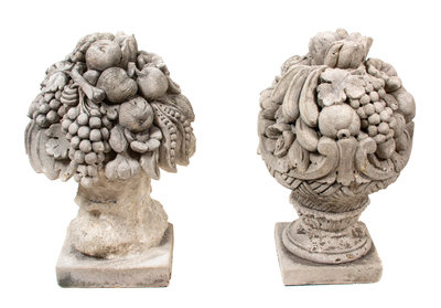 A Pair of Poured Cement Sculptures of Fruit Topiary Height 25 x diameter 15 inches.