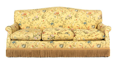 An Upholstered Three-Cushion Sofa Height 34 1/2 x width 82 inches.