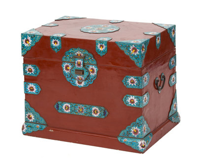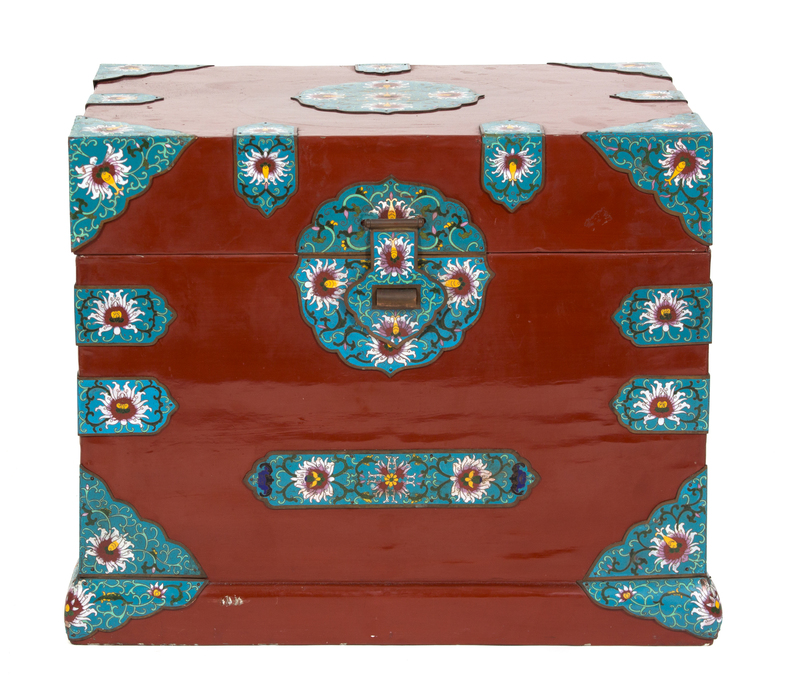 A Chinese Red Lacquer Bride's Box with Champleve Enamel Mounts Height 21 x width 25 1/2 x depth 18 1/2 inches.