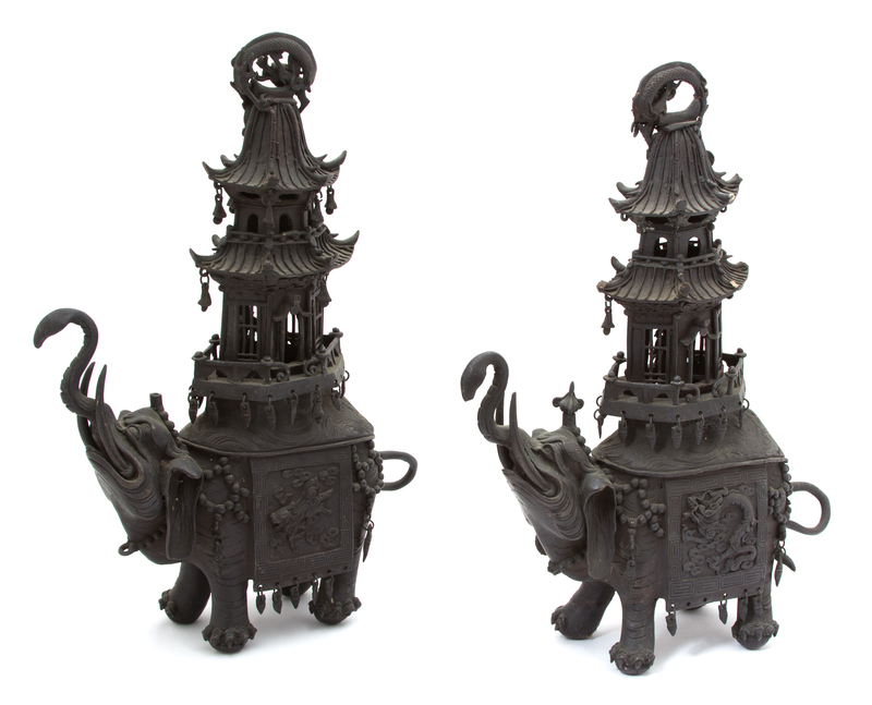 A Pair of Chinese Bronze Elephant Incense Burners Height 19 1/2 inches.